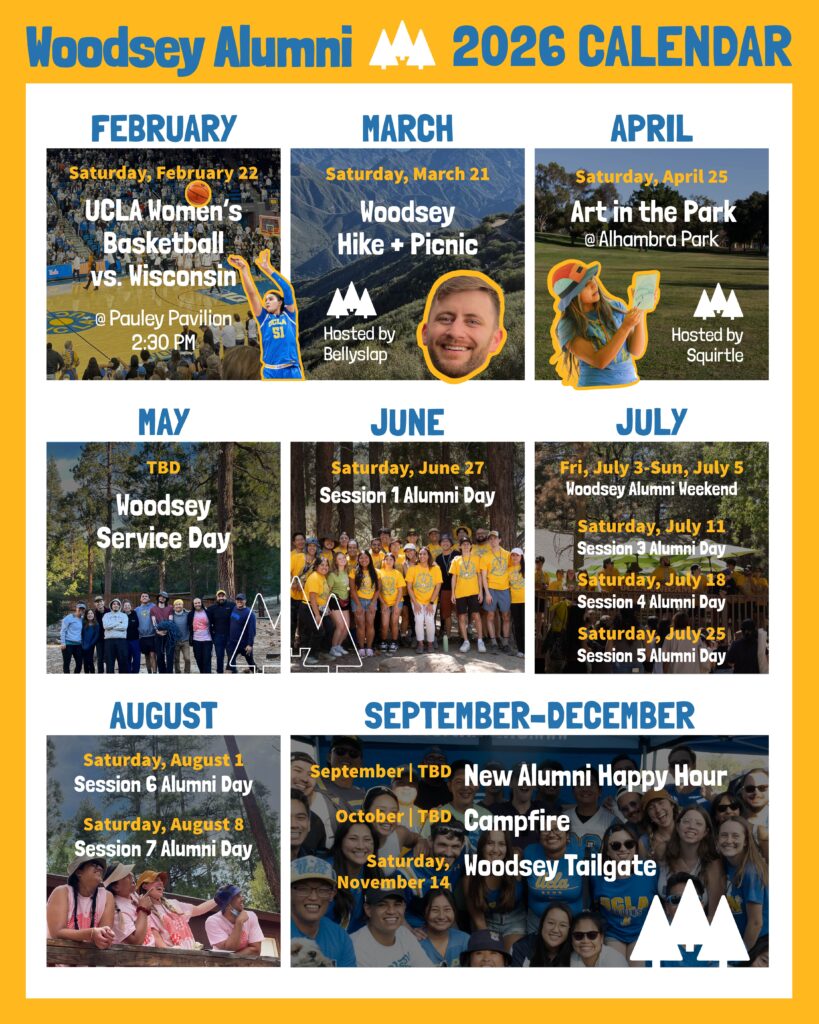 Events include bonfires, happy hours, food crawls, tailgate parties, and much more. In addition, alumni will have the opportunity to visit Camp River Glen over a work or family weekend, volunteer during a summer Alumni Day, mentor current UCLA UniCamp sessions, and reconnect with other Woodseys from their past sessions.